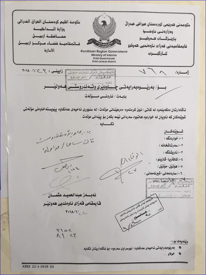 January 2018 order requiring business owners in Ankawa to renew licenses with the Erbil Center District.