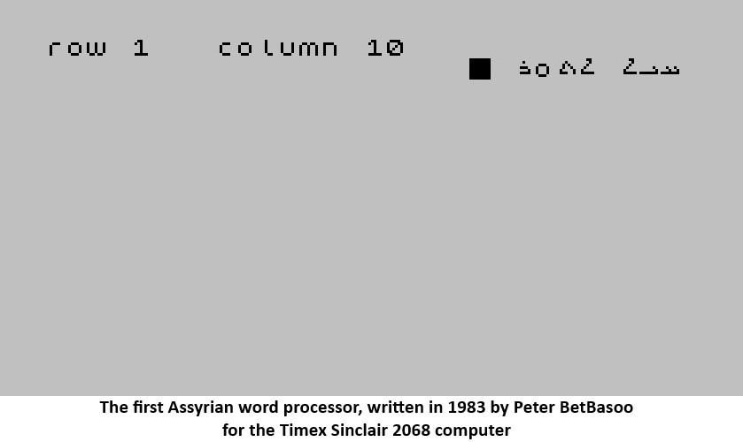 The earliest documented support for Assyrian computer processing was by Peter BetBasoo in 1983, when he programmed his Timex Sinclair 2068 computer to write and print in Assyrian. This was a technologically limited implementation, supporting only the alphabet, with no support for diacritical marks and other symbols. The coding scheme for the Assyrian alphabet was proprietary.