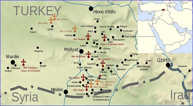 Arbo is located in the Tur Izla region of Tur Abdin --the Biblical reference to a region called "Izal" in Ezekiel 27:19 could well refer to the region of Tur Izla: "and casks of wine from Izal in exchange for your wares: wrought iron, cassia and calamus."