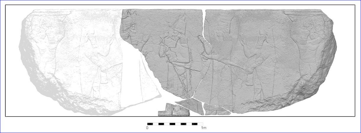 In 2022, a team from the University of Heidelberg in Germany, led by Prof. Aaron Schmitt, began excavating the North Palace of Nineveh. The ruins of Nineveh lay on the east bank of the Tigris River, close to the city of Mosul in modern-day Iraq. The large relief was found in multiple pieces behind a niche located opposite the throne room. The relief would have originally been 18 feet long and 12 feet high and weigh about 13.2 tons.