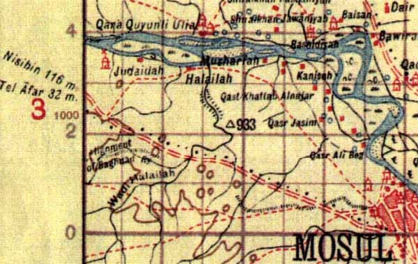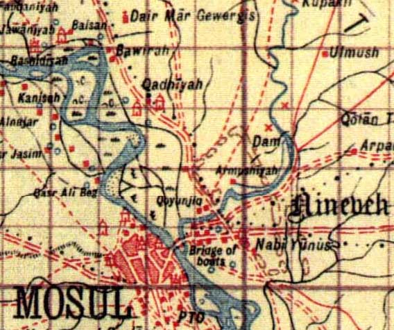 6 miles north-east of Mosul. Situated on the east side of the river Tigris.