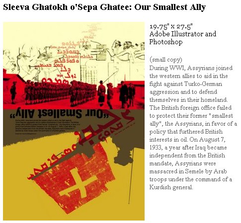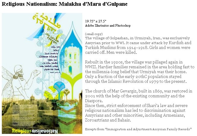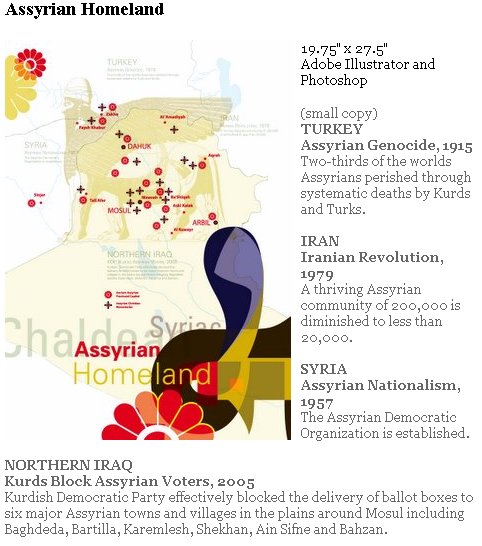 Graphic Design is a form of visual art that is concerned with the presentation and management of image and text as well as their relationships. Its primary function is to communicate by creating either a visceral reaction or to initiate an intellectual decoding process or both. The form of the neo-Assyrian alphabet, specifically Eastern Syriac letterforms, has a unique affect on my design sensibilities, as they are the core foundation of my semiotic coding of meaning. Assyrian is my mother's language; what I heard in relation to what I saw visually and what I first coded and decoded, gives meaning to the world around me. I have chosen to examine the semiotics of this letterform along side ancient Assyrian patterns, by constructing and deconstructing their form. Through this investigation, the subject matter spans 20th Century Assyrian history, depicting an autobiographical connection to the subject.