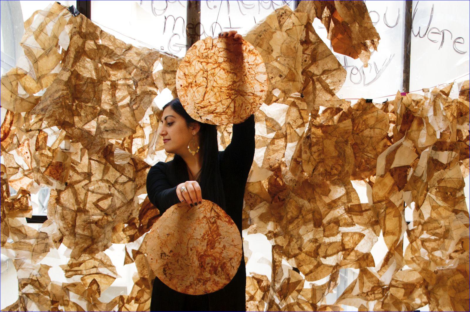 Nissan, a Master of Fine Arts student, is creating an immersive sensorial installation project. The project will be made from coffee and tea filters that she is collecting from both cities. In its final state the project will be an entire room of filters that have been sewn together to look like a tent.