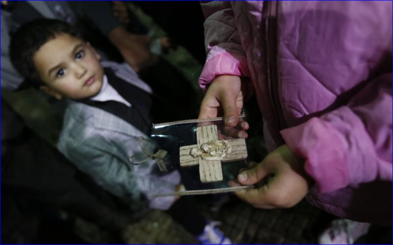 Iraqi Assyrian refugee girl holds souvenir of Holy Family as boy looks on at a Lebanese church (CNS).