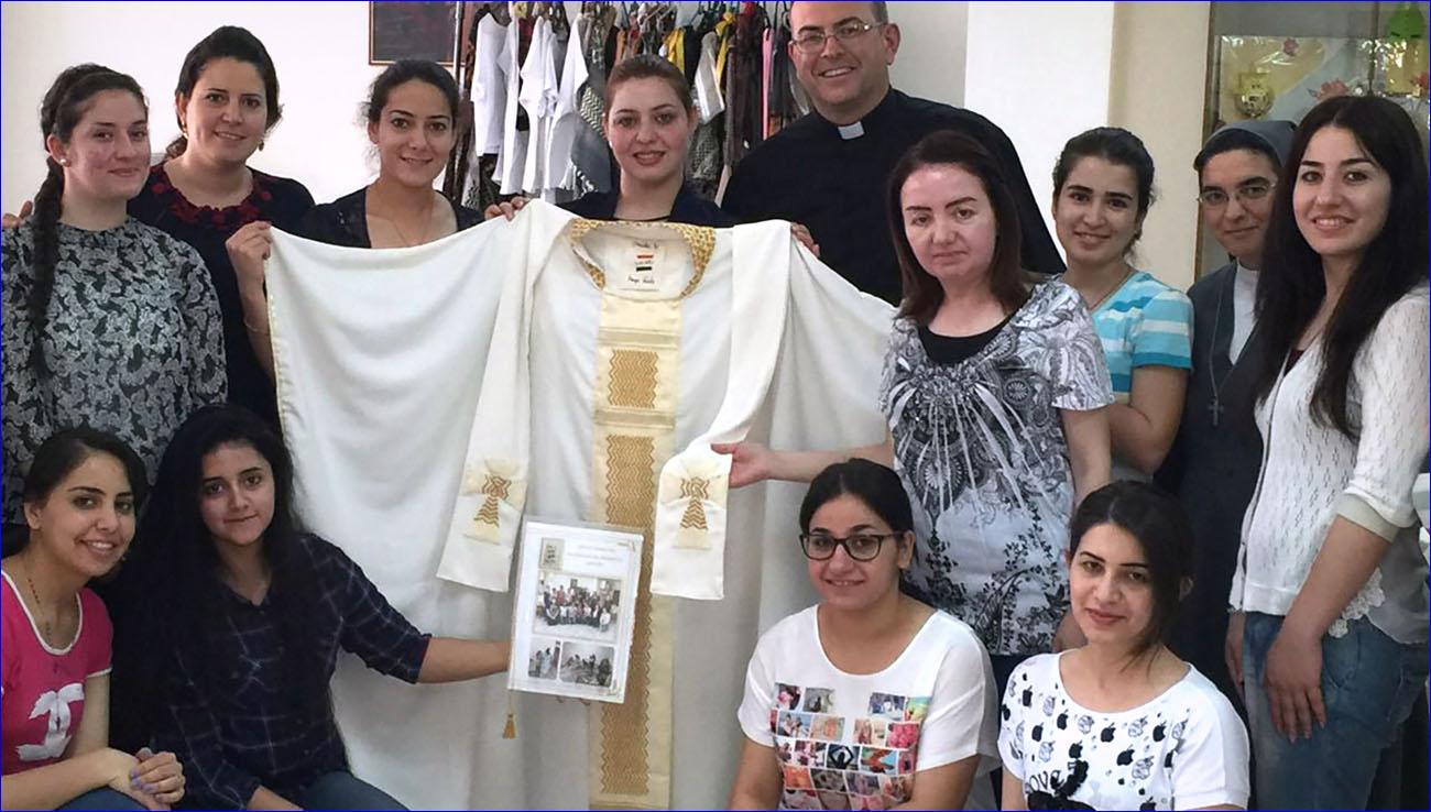 The ivory colored mantle with an oriental yellow-gold braid was designed and sewn by more than a dozen Chaldean Catholic women, who as refugees are unable to work in Jordan.