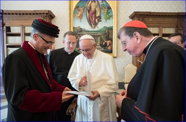 Dear Brothers and Sisters, I extend a warm welcome to all of you. I thank you for your visit and Metropolitan Meelis Zaia for his kind words on your behalf. Through you I convey my fraternal greeting in the Lord to His Holiness Mar Gewargis III, recalling with joy our cordial meeting a year ago, which marked a further step on our journey towards deeper growth in mutual solidarity and communion. Our meeting today offers us the opportunity to look with gratitude upon the progress made by the Joint Commission, established following the historic signing of the Common Christological Declaration here in Rome in 1994. After professing the same faith in the mystery of the Incarnation, the Commission planned two phases of dialogue: one on sacramental theology and one on the constitution of the Church. I join you in thanking the Lord for today's signing of the Joint Declaration which brings to a happy conclusion the phase regarding sacramental life. We can now look to the future with even greater confidence and I ask the Lord that your continuing work may help bring about that blessed and long-awaited day when we will have the joy of celebrating, at the same altar, our full communion in Christ's Church. I would like to emphasize one aspect of the new Joint Declaration, where the sign of the cross is referred to as "an explicit symbol of unity among all sacramental celebrations". Some authors of the Assyrian Church of the East have included the sign of the cross among the sacred mysteries, convinced that every sacramental celebration depends precisely on the Pasch of the Lord's death and resurrection. This is a beautiful insight, because the Crucified and Risen One is our salvation and our life. Hope and peace come from his glorious cross, and from the cross flows the unity of the sacred mysteries we celebrate, as well as our own unity, for we were baptized into the same death and resurrection of the Lord (cf. Rom 6:4). When we look at the cross, or make the sign of the cross, we are also invited to remember sacrifices endured in union with Jesus and to remain close to those who today bear a heavy cross upon their shoulders. The Assyrian Church of the East, along with other Churches and many of our brothers and sisters in the region, is afflicted by persecution, and is a witness to brutal acts of violence perpetrated in the name of fundamentalist extremism. Situations of such tragic suffering take root more easily in contexts of great poverty, injustice and social exclusion, largely caused by instability, often fuelled by external interests, and by conflicts that have also led in recent times to situations of dire need, giving rise to real cultural and spiritual deserts, within which it becomes easy to manipulate people and incite them to hatred. Such suffering has recently been exacerbated by the tragedy of the violent earthquake on the border between Iraq, the homeland of your Church, and Iran, where your communities have also long been established, as well as in Syria, Lebanon and India. As a result, particularly during periods of greater suffering and deprivation, large numbers of the faithful have had to leave their lands and emigrate to other countries, thus increasing the diaspora community, with the many trials it faces. Arriving in some societies,