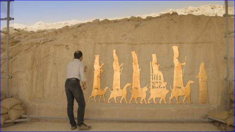 Lost World of the Hanging Gardens shows the moment archaeologist Aaron Schmitt makes a remarkable discovery -- a carving of the great Assyrian king, and Sennacherib's grandson, Ashurbanipal. It's the first time the artifact has seen the light of day in thousands of years.