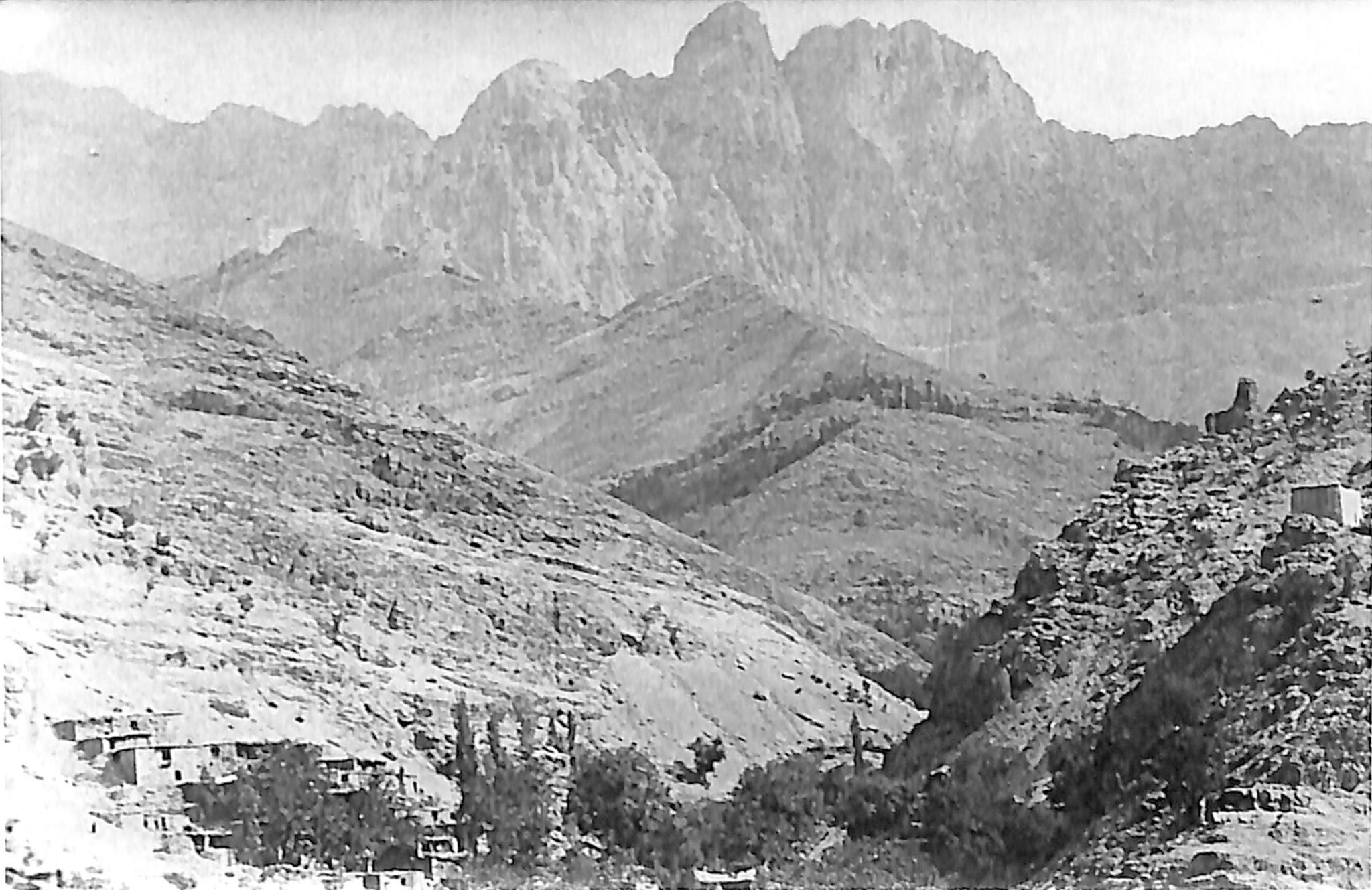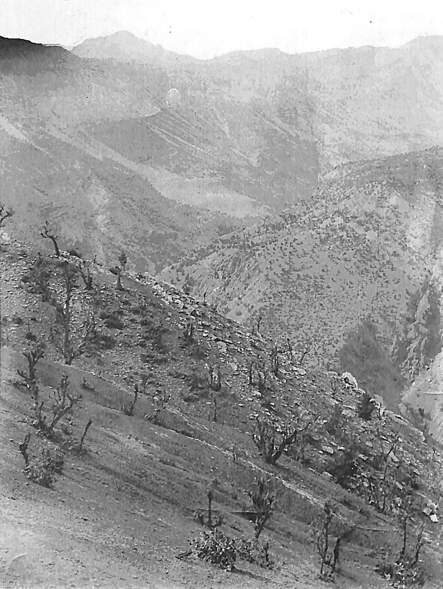 Mountains separating the plain of Gawar (Yüksekova) from the district of Baradost at the village of Bazhirga (Esendere), on the Ottoman-Persian border. "We drove up to the village of Bazhirga. Here the river moves apart and the village stands on a hill, washed by the river on both sides. Earlier there was a Turkish customs, the building of which still looms in the vicinity of the village. Before reaching Bazhirga, we went down to the irrigation ditch, cross that one, and a little lower the river, and follow its shore. A lot of hay can be seen around." -- at Esendere Yüksekova Hakkari. The town of Dizza d-Gawar (Yüksekova), the administrative centre of the Gawar district, from the banks of the Nihela River -- in Hakkâri Yüksekova'da. Mountains separating the plain of Gawar (Yüksekova) from the district of Baradost.