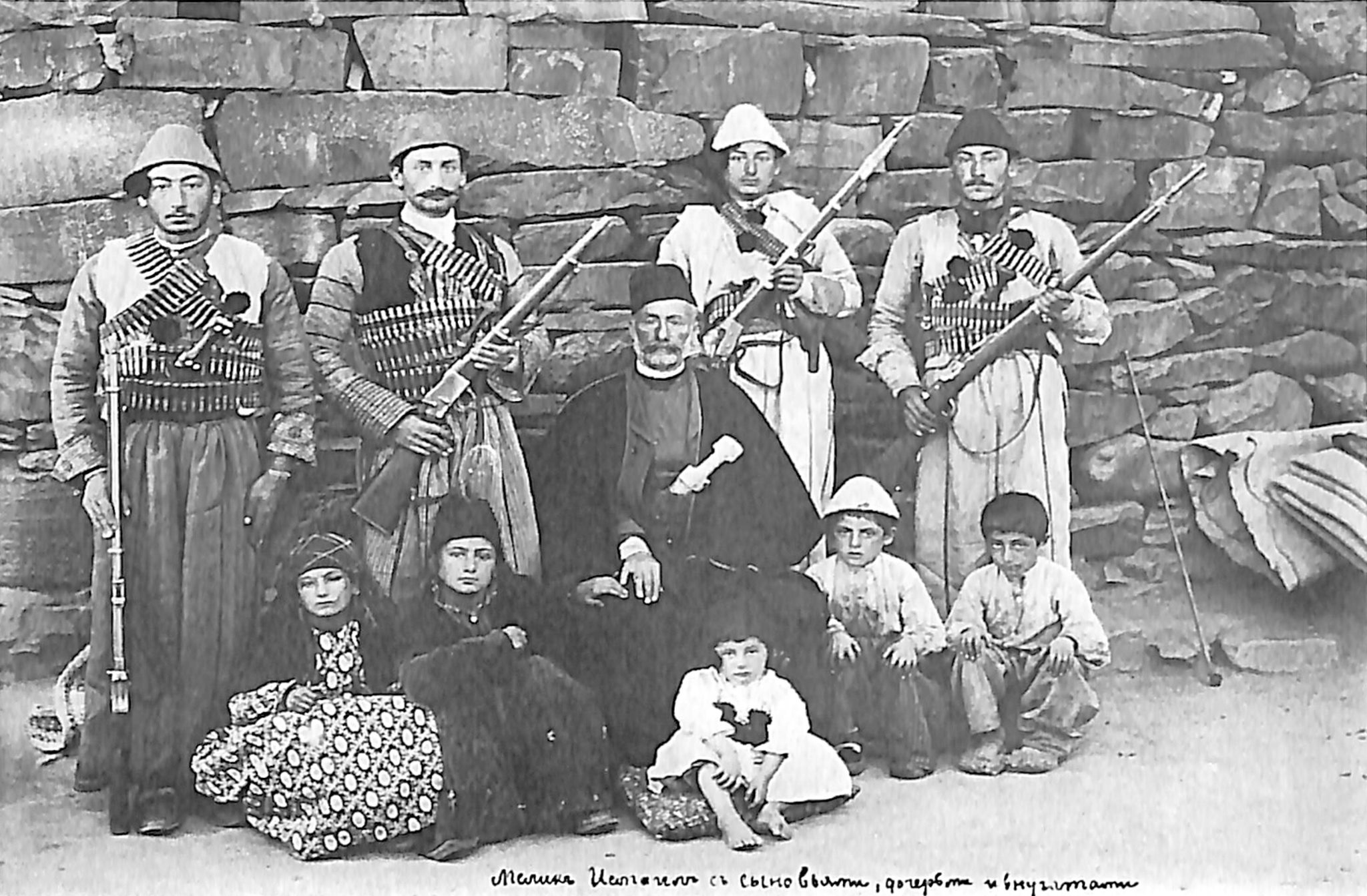 The residence of the Mar Shimun and his family in Qudchanis -- in Konak, Hakkari. Mar Shimun XXI Benyamin, Catholicos-Patriarch of the Church of the East (1903-1918) -- in Konak, Hakkari. Mar Shimun XXI Benyamin, Catholicos-Patriarch of the Church of the East, flanked by Metropolitan Mar Isaac Khnanisho of Shemsdinan (left) and Bishop Mar Eliya Abouna of Alqosh (right) -- in Konak, Hakkari. Family members of Mar Shimun XXI Benyamin at Qudchanis (left to right): his brother Zaya; his sister-in-law Esther d-Beth Matran of Shemsdinan, wife of David, with baby Rowena on her lap; his sister Lady Surma; (probably) his neice Asyat; his brother David, with little Eshai (later Mar Shimun XXIII Eshai) on his lap; and, (probably) Paulus (later Mar Shimun XXII Paulus) -- in Konak, Hakkari.