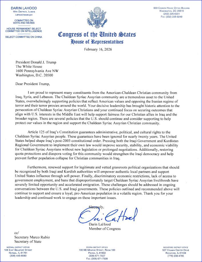 Central to the congressman's appeal is Article 125 of Iraq's Constitution, which guarantees administrative, political, and cultural rights to the Chaldean Syriac Assyrian people. According to LaHood, those protections have gone largely unimplemented for nearly two decades. LaHood's letter follows strong advocacy for Article 125 by the Chaldean Community Foundation, the Assyrian American National Federation, Vote Assyrian, and the Assyrian American Chamber of Commerce.