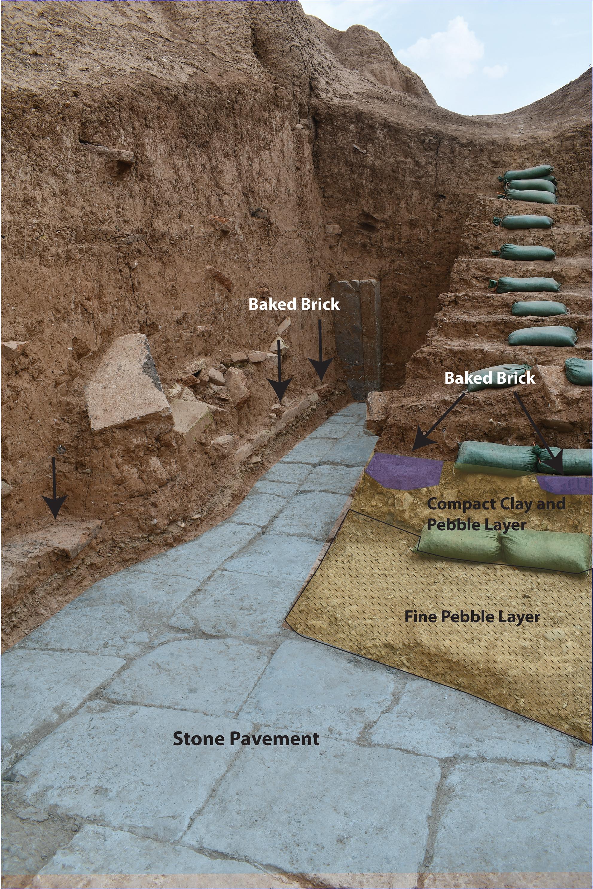 The earlier phase pavement consisted of large stone blocks of different sizes, perhaps laid out as part of the construction of the gate during Sennacherib's (705--681 B.C.E.) expansion of the city. The upper pavement is less clear in terms of its composition, due to its patchy preservation in Operation 1. The pavement appears to have been constructed of three layers, with an initial layer of mudbricks and fill present in some sections meant to level the floor (where the stone pavement may have dipped). A second layer of fine pebbles embedded in a hard clay matrix, which constituted the base of the pavement, lay on top of the bricks, occasionally resting directly on the stone pavement. This second layer was the most coherent and was preserved in better condition than the upper layer of the pavement. The third layer seems to have been a fill formed of compact clay with interspersed pebbles and fragments of broken baked bricks. Embedded within this layer (Loc. 2881), were fragments of the stela, as well as human remains and other artifacts. In addition to the sequence observed in the passageway, the side chambers appeared to have been paved with baked bricks. Traces of a conflagration, manifest as pockets of ash and charcoal, were also noted in the area of the dense concentration of artifacts.
