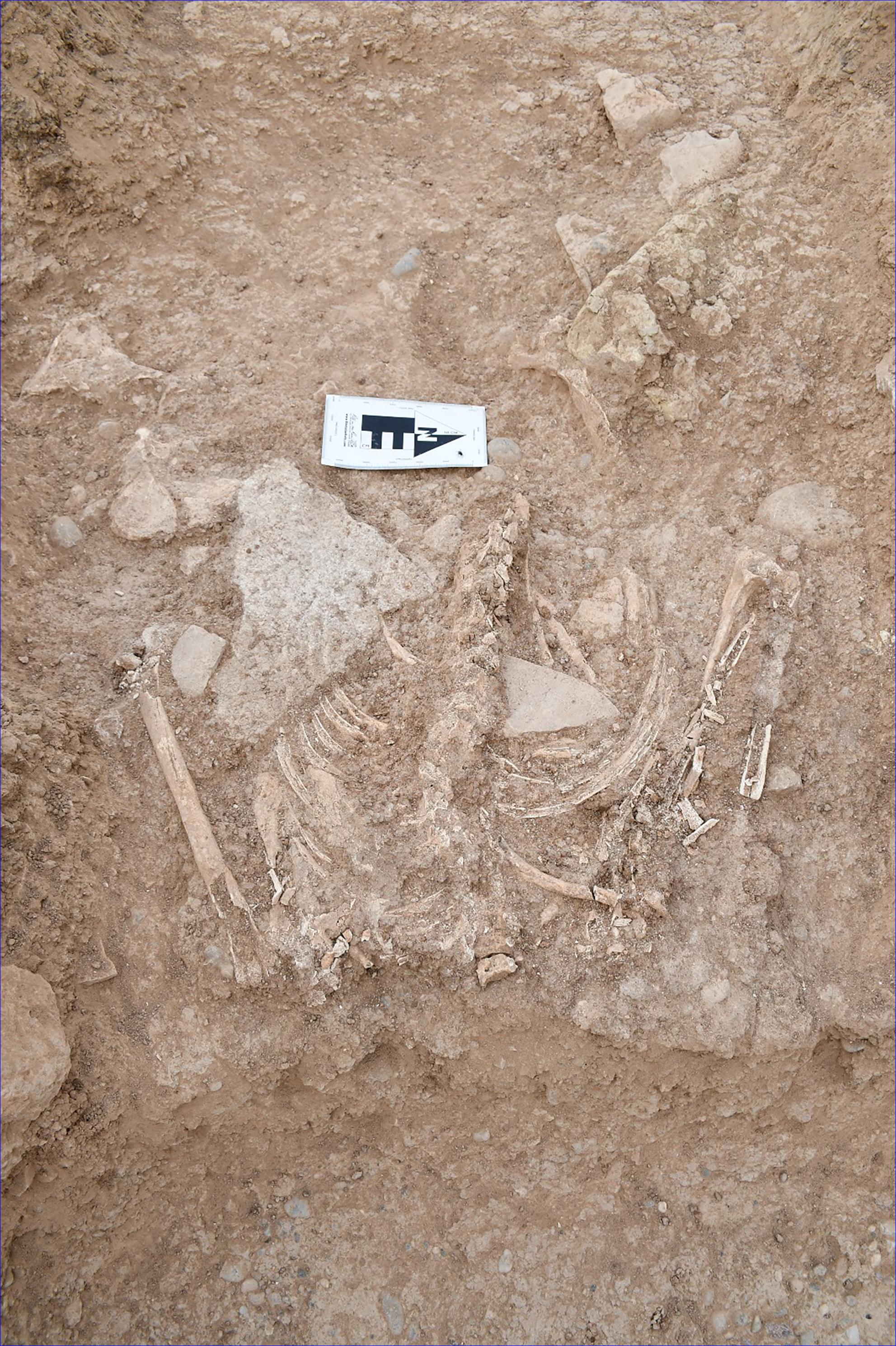 At the west (inner) entrance of the Shamash Gate, the poorly preserved remains of an adult individual were found in a face-down position, with both upper arms at the sides of the torso and tightly flexed at the elbows so that the hands were in front of the neck. The bust had no cranium associated with it; an extremely fragmented mandible (with a brick covering it) was found near the articulated skeleton. A second partial brick was found over the right upper back, partially covering the ribs and a third brick fragment lay near the left pelvic area. The preserved bust of this individual ends with the lower thoracic and first lumbar vertebrae. The pelvic region was disarticulated (likely due to erosion), and the left and right side of the os coxea were found at a distance from the articulated remains. No lower limbs were found.